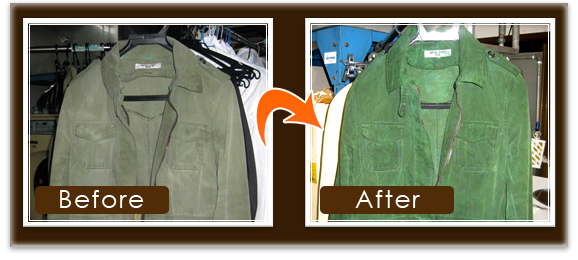 グリーンの綿のコートが、ヤケ、摩れなどで、変色しています。他店のクリーニング店からの依頼です。お客様とご相談の上、全体の色を 濃い色に、復元加工をしました。